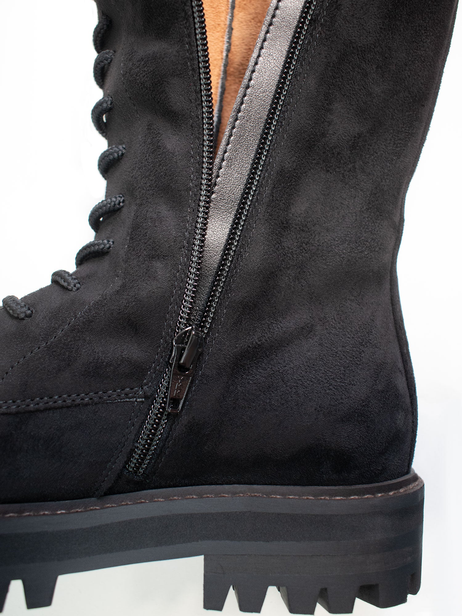 Das 17-Ösen-Obermaterial ist so geschnitten, dass es auf der Oberseite Ihrer Waden sitzt (Größe 37 misst 34 cm von der Stelle, an der Ihr Fuß sitzt, bis zur Oberseite des Schafts). Sie sind aus einem schönen, schwereren veganen Wildleder gefertigt, das sich rauer und traditioneller anfühlt als unser übliches veganes Wildleder. Wenn Sie mit der Hand über den Schuh streichen, können Sie die Maserung fühlen und sehen, wie sie sich mit Ihrer Bewegung bewegt.