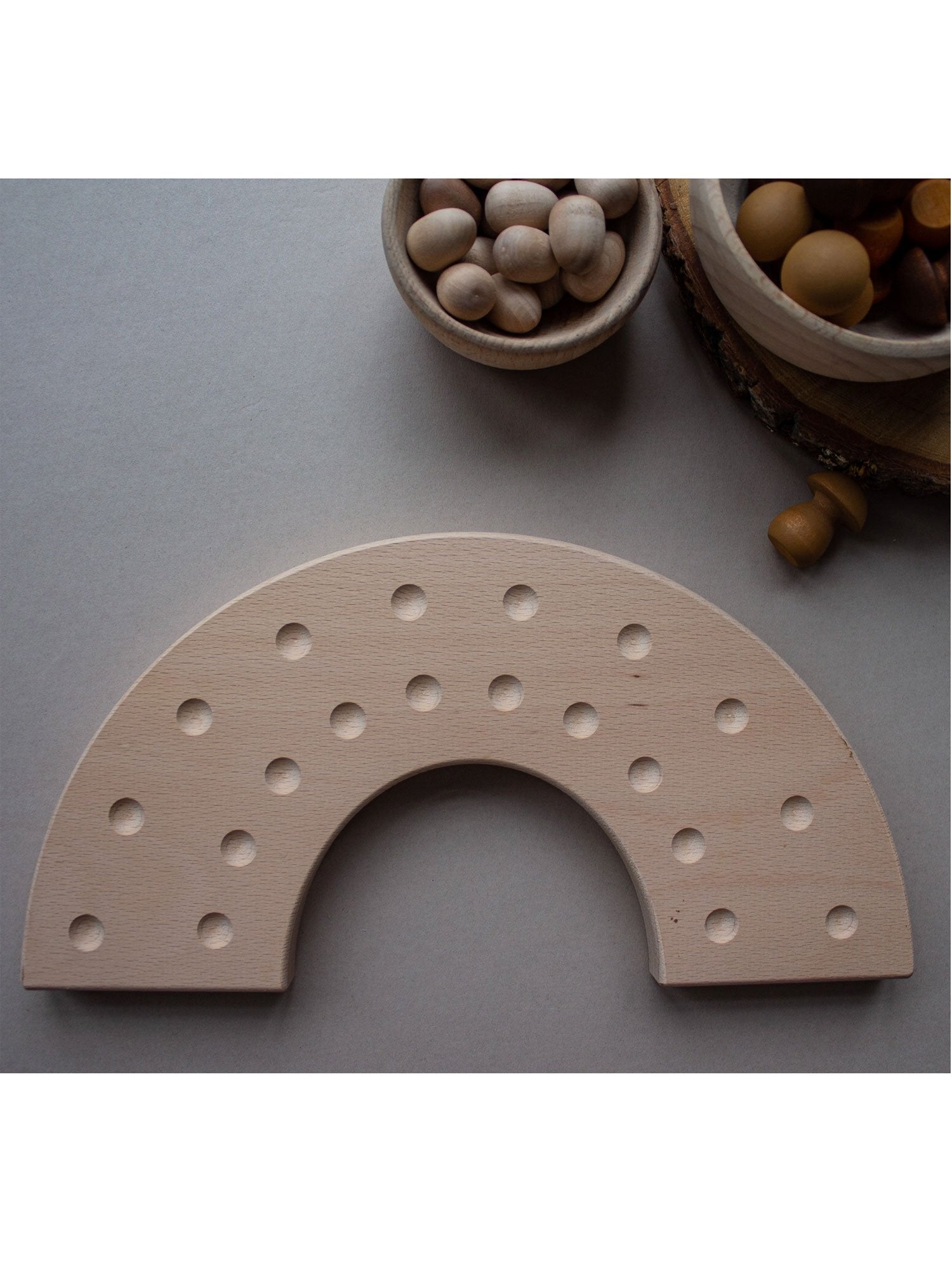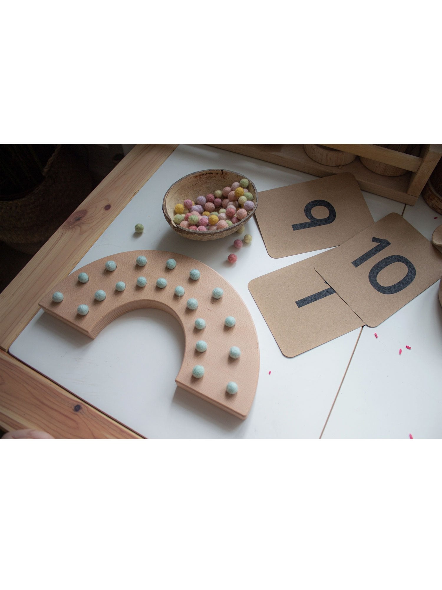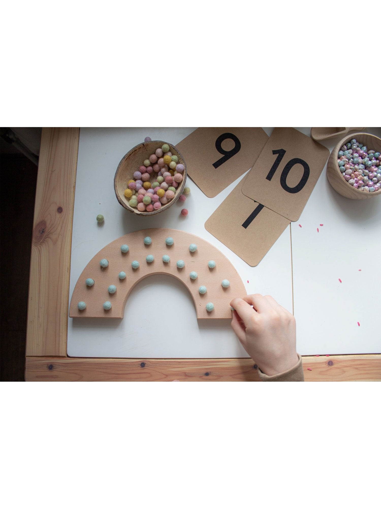 Wie bei allen unseren Produkten möchten wir, dass sie ein maximales Lernpotenzial haben. Deshalb sind unsere feinmotorischen Tafeln auch Zählrahmen. Unsere Regenbögen haben zwei Reihen mit 10 Löchern, die für das Erkennen von Zahlenverbindungen, Zahlenpaaren (z. B. 3+7=10) und das Zählen in 2er-Schritten verwendet werden können.