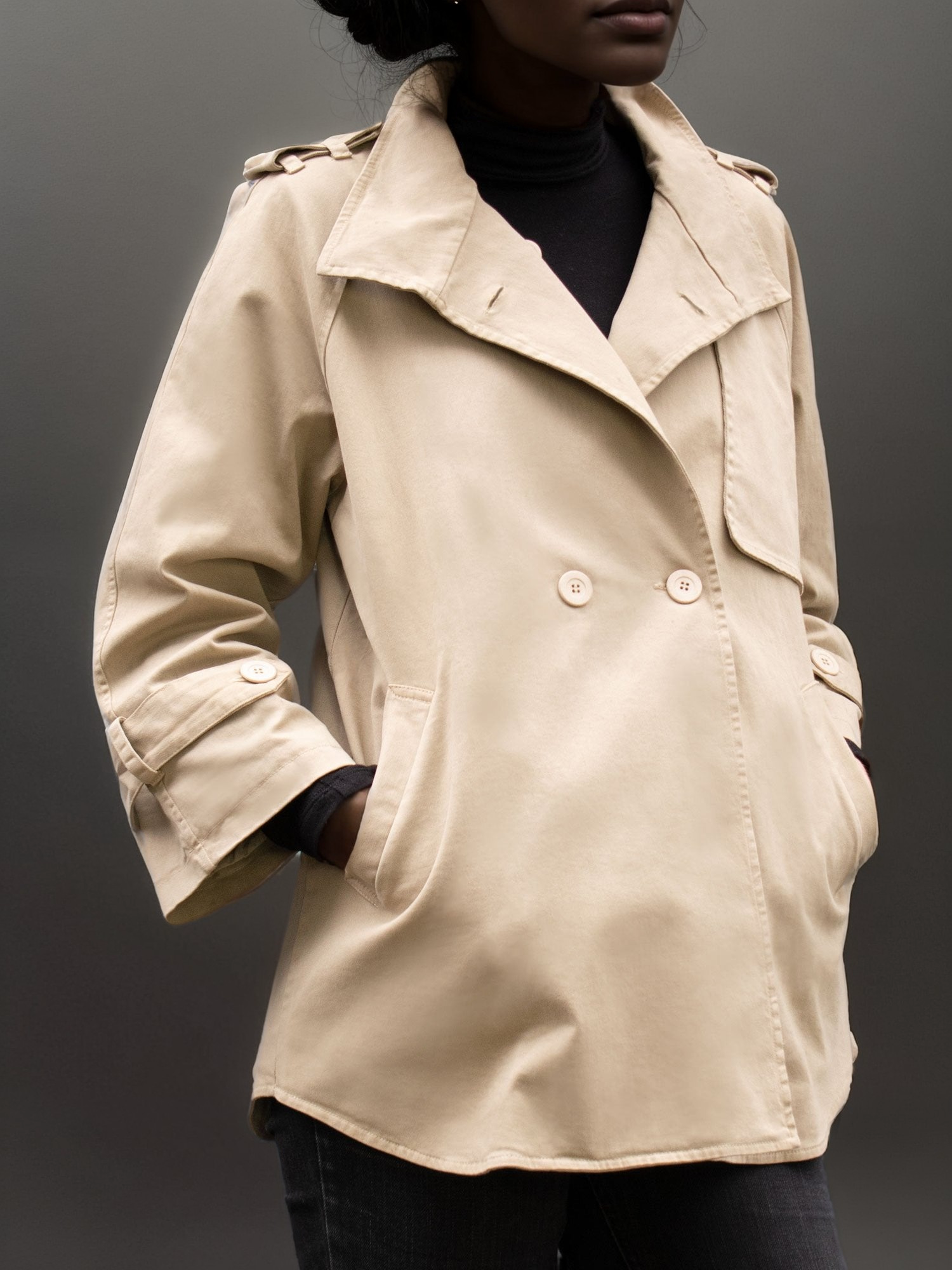 - Alle Merkmale eines klassischen Trenchcoats, darunter militärisch inspirierte Schulterklappen, eine zweireihige Front, Schnallenmanschetten, breite Aufschläge und eine Sturmklappe.