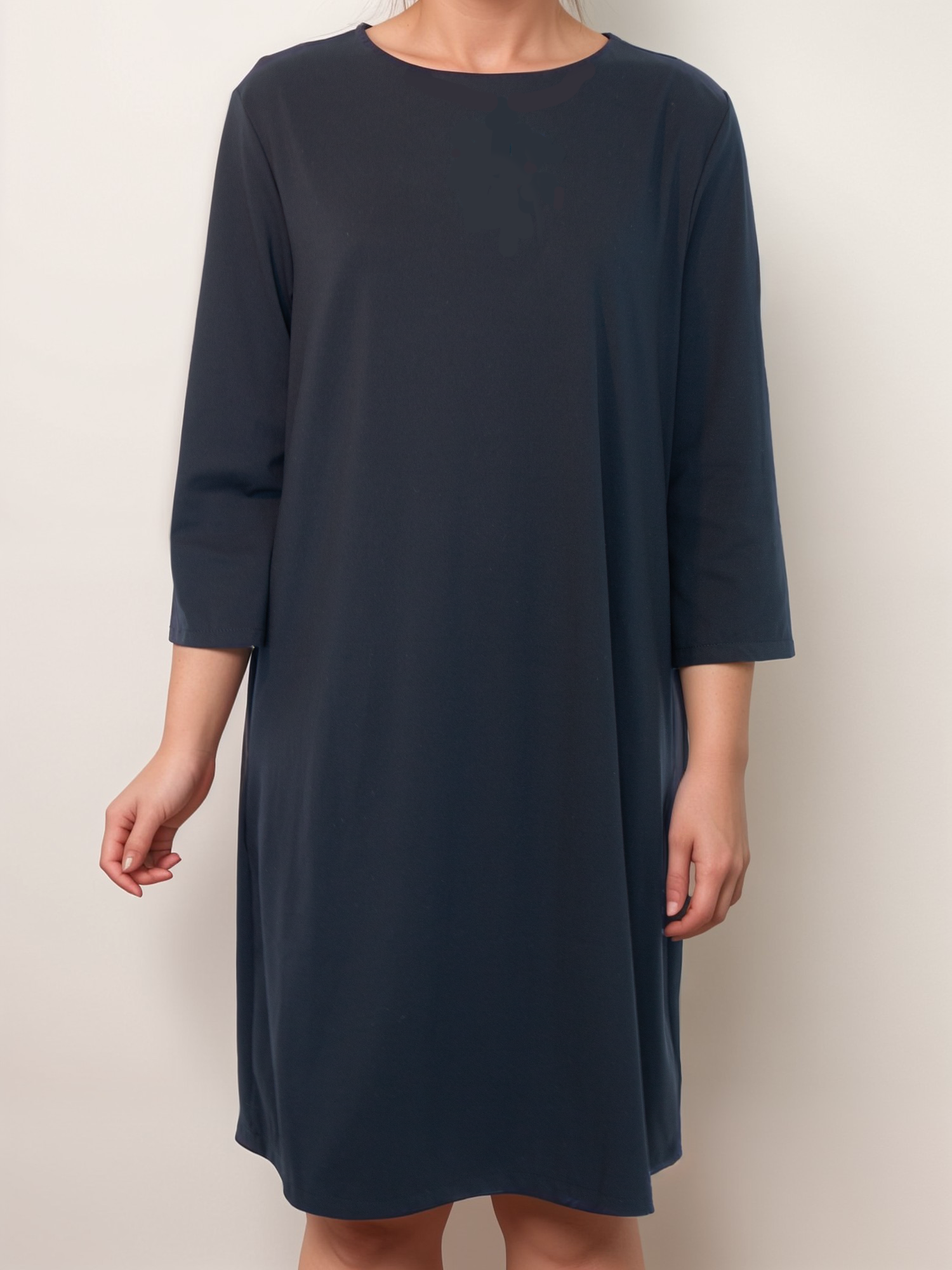 - Großzügig geschnittenes, vielseitiges Etuikleid, das bis zum Knie oder knapp darunter reicht. Es hat 3/4-Ärmel ohne Schulterpolster. Es gibt zwei diskrete, unsichtbare Taschen für Komfort und einfache Handhabung. Auf der Rückseite befindet sich ein einfacher Knopfverschluss.